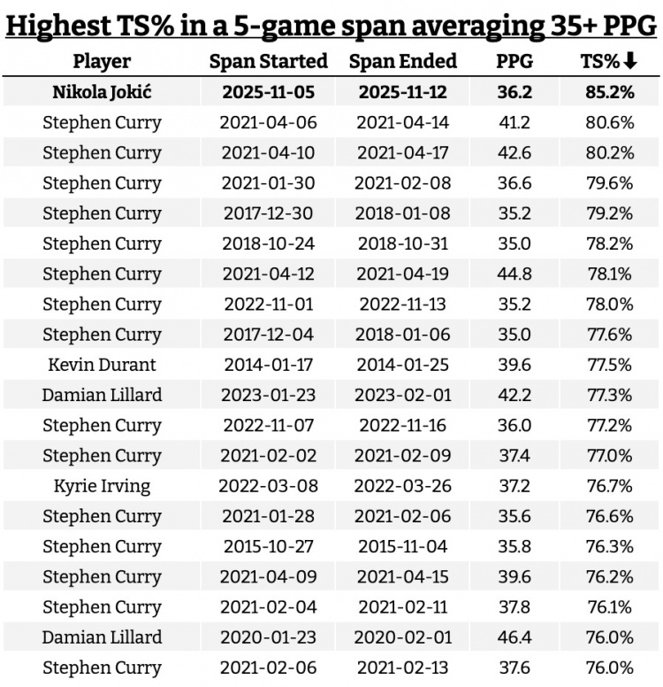Averaged 35+ true shooting percentage in 5 consecutive games: Jokic leads the way in the past 5 games, Curry dominates the screen