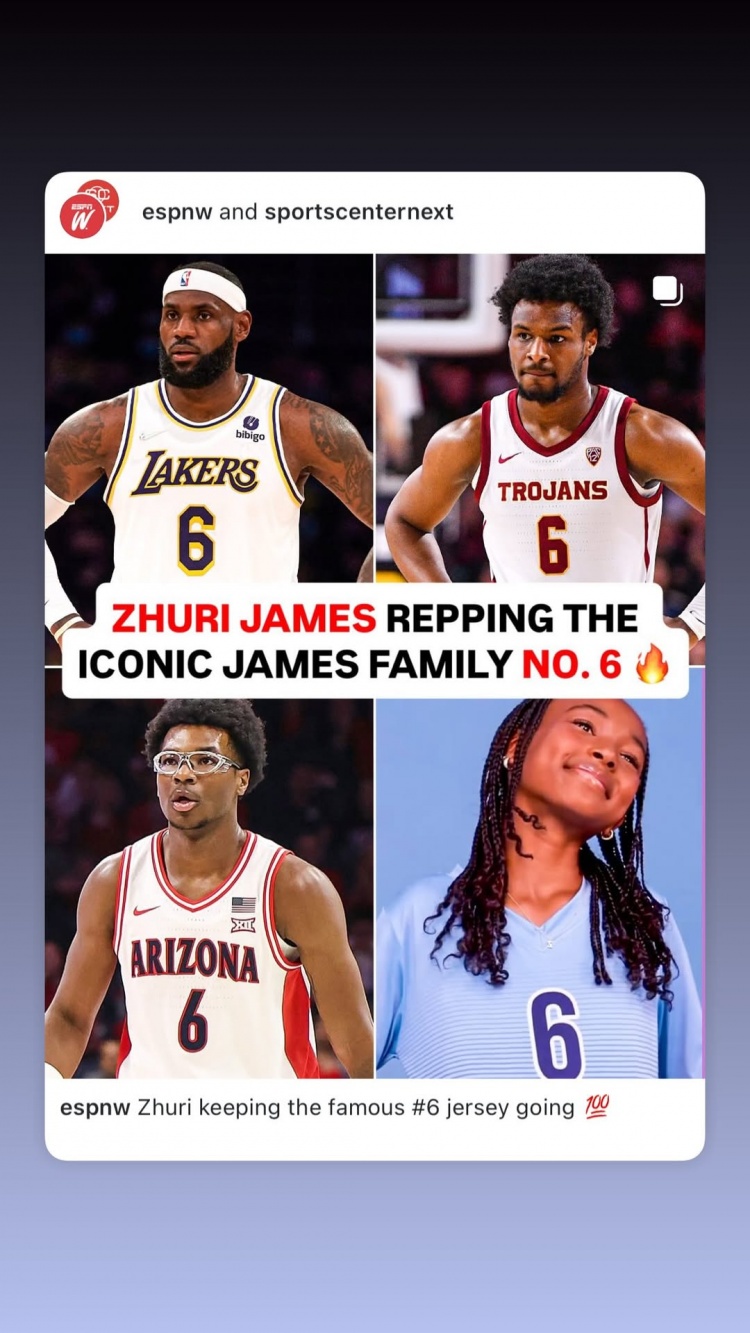 James forwarded a photo posted by the media of him and his three children wearing the No. 6 jersey. James' two sons, Bronny and Bryce, both wore No. 6 jerseys when they played basketball in college, and his daughter Zhuri wore No. 6 jerseys when she played volleyball at school. James himself also wore No. 6 jersey for 6 seasons with the Heat and Lakers.