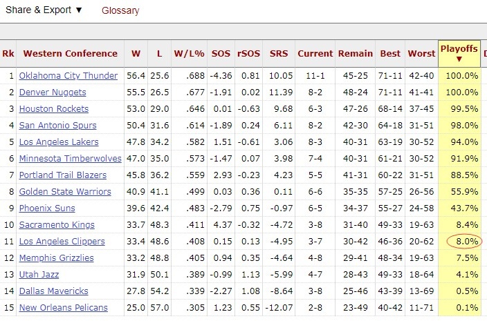 Today's playoff advancement probability from data website Basketball Reference shows that the Clippers have an 8% probability of reaching the playoffs, which ranks fifth from the bottom in the Western Conference.