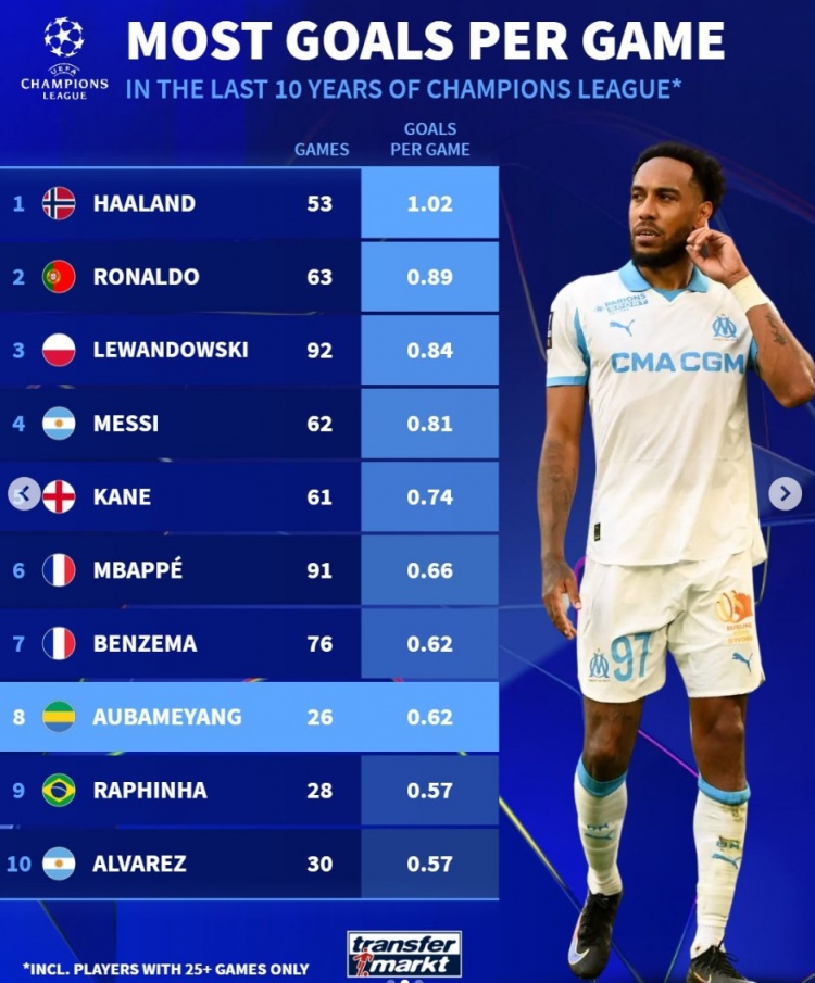 Marseille reversed Newcastle 2-1 in this round of the Champions League, with Aubameyang scoring twice. "Transfer Market" statistics show that he is also in the top ten in the Champions League goals per game in the past 10 years.