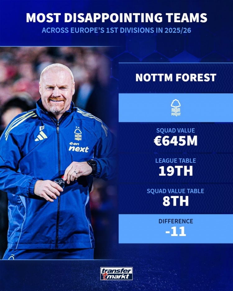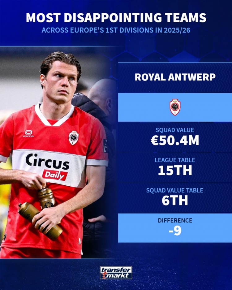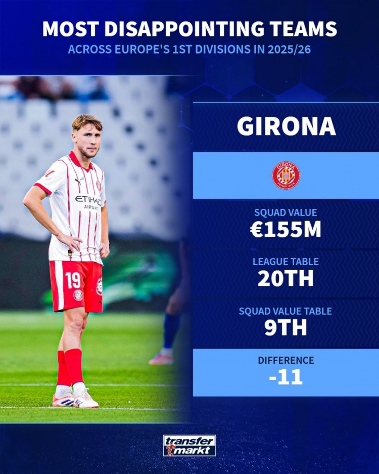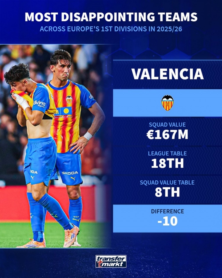 The German transfer market has listed the most disappointing teams in Europe's top leagues this season based on the team's worth and current ranking. Fiorentina, Newcastle United, and Athletic Bilbao are on the list.