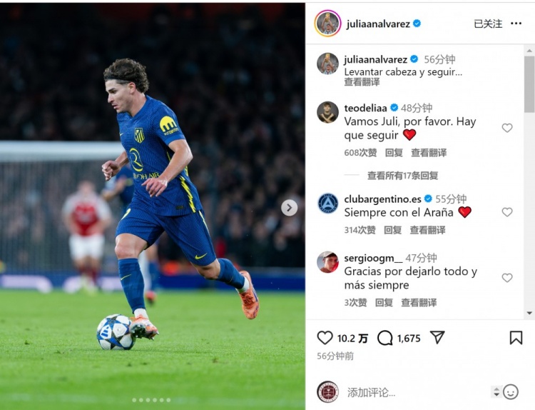 Atletico Madrid forward Alvarez played the entire game. After the game, he posted photos of the game on social media with the text: "Keep your head up and keep moving forward."