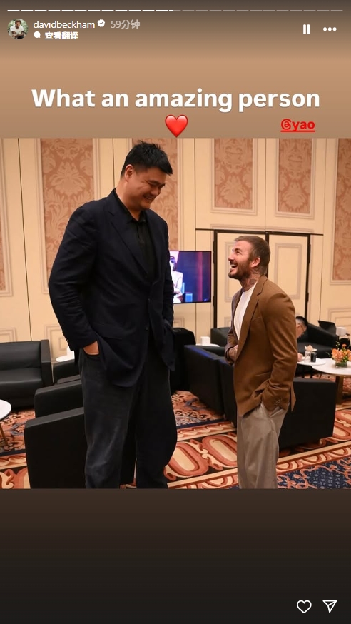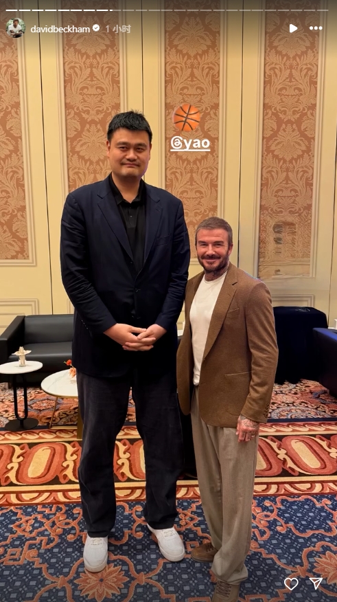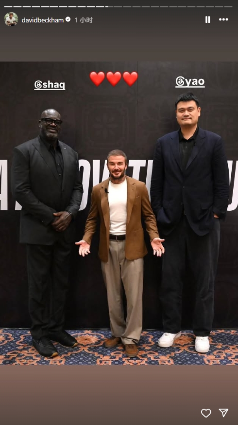 Recently, Beckham watched an NBA preseason game and took photos with Jackie Chan, Yao Ming, and O'Neal.