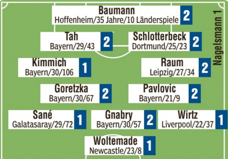 Defenders: Kimmich (1), Jonathan Tower (2), Schlotterbeck (2), Laum (2)