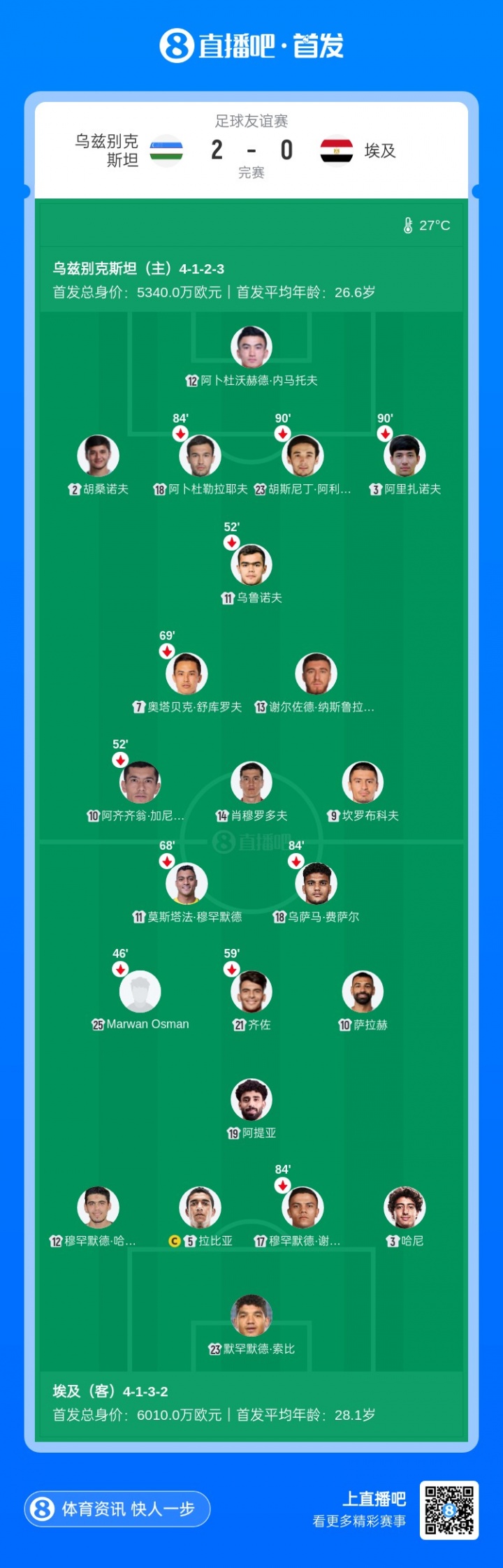 In the international football friendly match, Uzbekistan defeated Egypt 2-0. Cannavaro achieved his second victory after taking office. He coached Uzbekistan with 2 wins and 1 loss in 3 games.