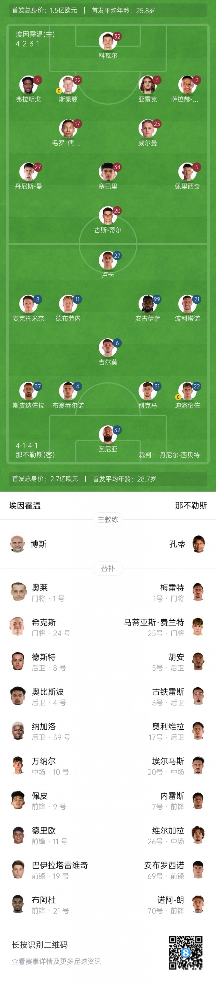 Naples has 3 points with 1 win and 1 loss in the Champions League, 5 wins and 2 losses in Serie A with 15 points, temporarily ranking third; PSV Eindhoven has 1 point with 1 draw and 1 loss in the Champions League, and 22 points with 7 wins, 1 draw and 1 loss in the Eredivisie temporarily ranks second. It has been unbeaten in all competitions for 5 consecutive games. PSV have won all 2 games against Napoli in history.