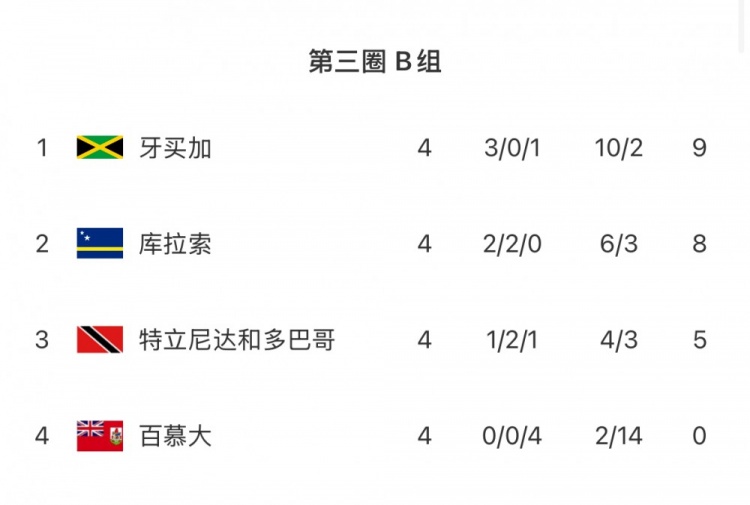According to the promotion rules, the 12 teams in the third stage are divided into 3 groups, with 4 teams in each group participating in a double round-robin competition. The top team in each group will directly advance to the World Cup. On November 14, Jamaica will face Trinidad and Tobago, Curacao will face Bermuda, and Jamaica and Curacao will face off on November 19.